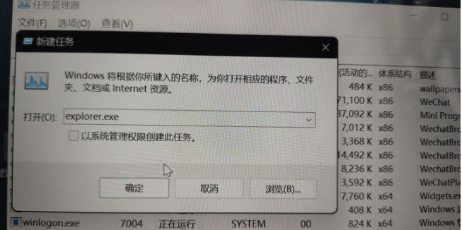 3、接着在新建任务窗口中输入“explorer.exe”,按下回车开始运行。