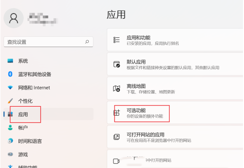 2、在打开的设置页面中,点击左侧的【应用】,在右侧栏目中找到【可选功能】进行点击。