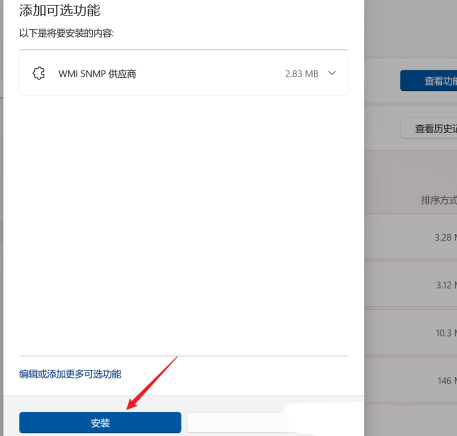 5、然后确定安装内容是【WMI SNMP 供应商】,再点击最下方的安装,等待安装完成即可。