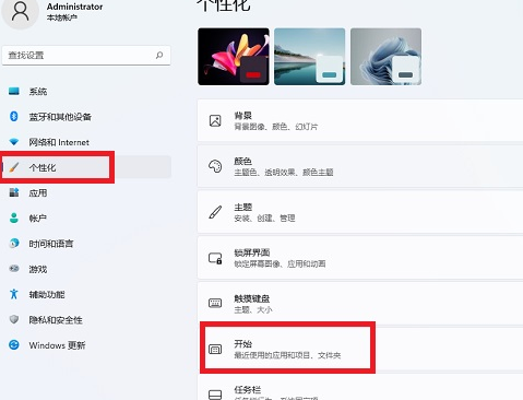 2、在打开的设置页面中,在左侧选择个性化进行点击,在右侧点击开始选项。