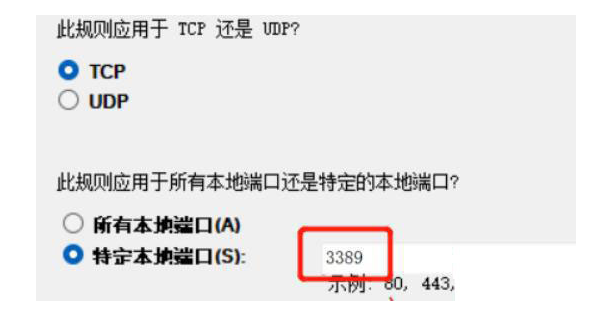 6、然后选择【TCP】、【特定本地端口3389】两个选项。