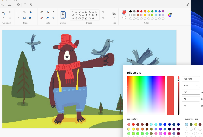 我们已经更新了“编辑颜色”、“调整大小和倾斜”以及其他对话框,以配合新的 Windows 11 设计风格,并与新的画图应用背景相适应。