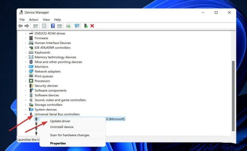 现在展开通用串行总线控制器文件夹,右键单击每个 USB 选项,然后点击更新驱动程序。