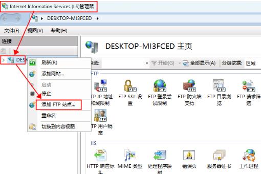 6、打开后在左侧 “网站” 右键菜单 打开 “添加FTP站点”。