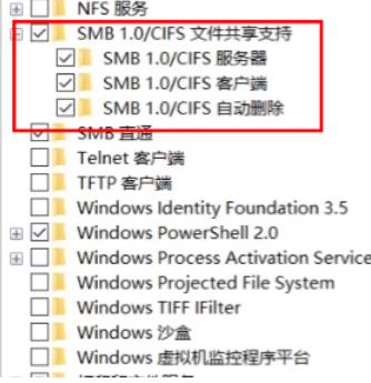 第四步:打开SMB1.0/CIFS共享组件,可实现免固定IP共享与Win7打印机和文件共享兼容。