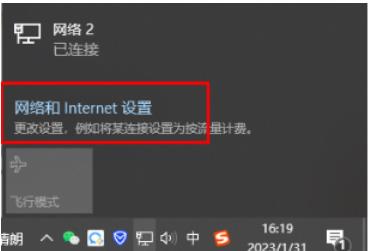 1、在任务栏中点击网络图标,选择“网络和Internet设置”打开。