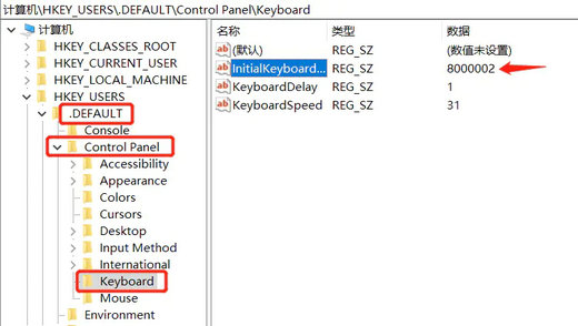 3、在注册表编辑器中,依次展开HKEY_USERS > .DEFAULT > Control Panel > Keyboard,点击Keyboard之后在右侧窗口中找到InitialKeyboardIndicators项目,双击进入。