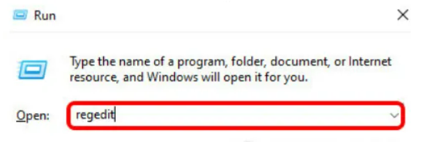 2、在运行命令窗口中,在搜索字段中键入regedit ,然后按 Enter 键打开注册表编辑器窗口。