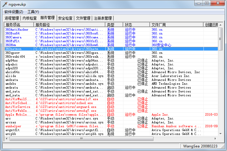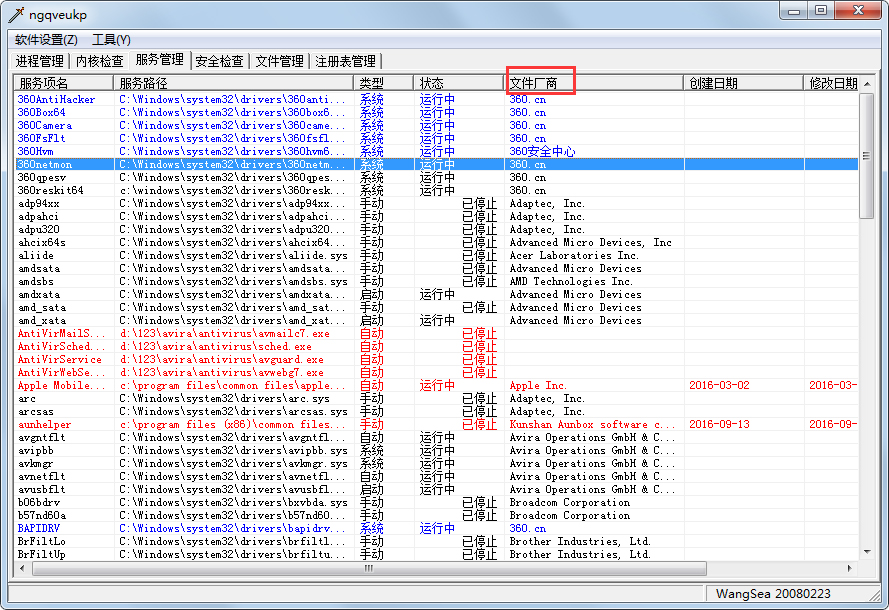 在取消了“模块、服务简洁显示”后,查看第三方服务可以点击标题条”文件厂商”排序,结合使用“启动类型”、“修改日期”排序更容易观察到新增的木马服务。