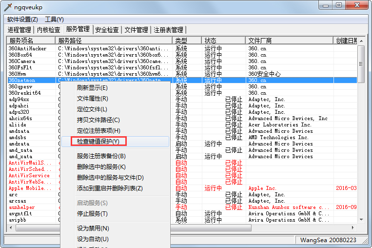 右键使用“检查键值”后,蓝色显示的是有键值保护的随系统启动的驱动程序。它们有可能是杀软的自我保护,也有可能是木马的键值保护。
