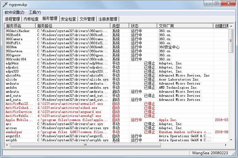 红色表示该服务不是微软服务,且该服务非.sys驱动。(最常见的是.exe与.dll的服务,木马大多使用这种方式)。