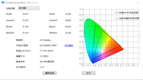 显示器色域检测工具是非实用的检测显示器色域工具,适用于硬件检测员或维修人员使用!这个工具的检测原理就是读取显示器的EDID值,可以详细罗列出你的显示器色域,同时还罗列出了显示器的制造商,产品型号,屏幕尺寸,制造年份和EDID版本,软件体积小巧非常完美!