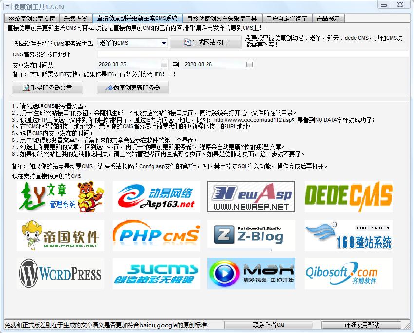 7、独家支持在线自能伪原创动易、新云、老丫、dede、帝国、PHPCMS、zblog等主流大型CMS系统。