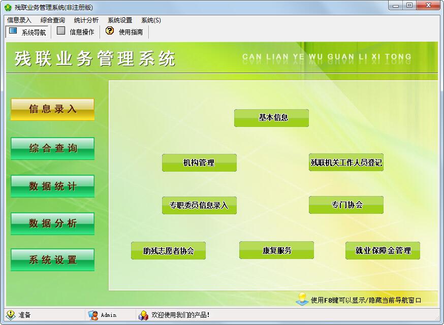 残联业务管理系统是专门为残疾人联合会开发的一款软件,残联业务管理系统包括了残联主要的业务内容。包含信息录入、综合查询、统计分析、系统设置等功能模块。本系统界面简洁、菜单功能一目了然,统计查询功能强大,可以方便地查询,您只需用鼠标点击一下相应节点,就可迅速的进行查询统计,以便您更好地进行管理。软件本着“优质软件、服务大众”的理念,设身处地的为客户着想,为客户提供强大的功能;为您奉献更优质的软件产品,界面更加友好,操作更加人性化,使用更加方便,让您的工作更加得心应手;更加的灵活!