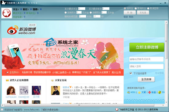 飞哈微博工具是飞哈软件工作室推出的一款微博工具,该工具是微博用户增加粉丝的得力帮手,全自动化的关注和取消关注、互粉和取消互粉功能,让你轻松增加粉丝数,不必每天花费大量时间去手工操作。 该工具是纯绿色免费软件,不必安装即可直接运行,占用系统资源少、界面美观、操作简单。
