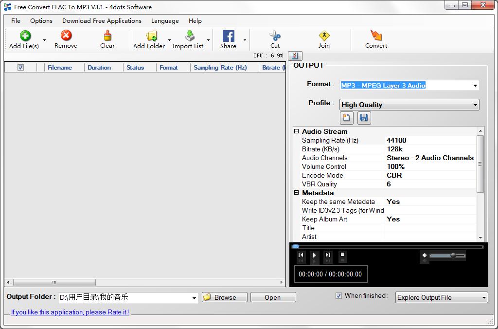 Free Convert FLAC To MP3的输入格式为FLAC,输出格式为MP3, M4A, AIFF, AAC, WMA, WAV, OGG, AC3, AMR, MP2, AU。