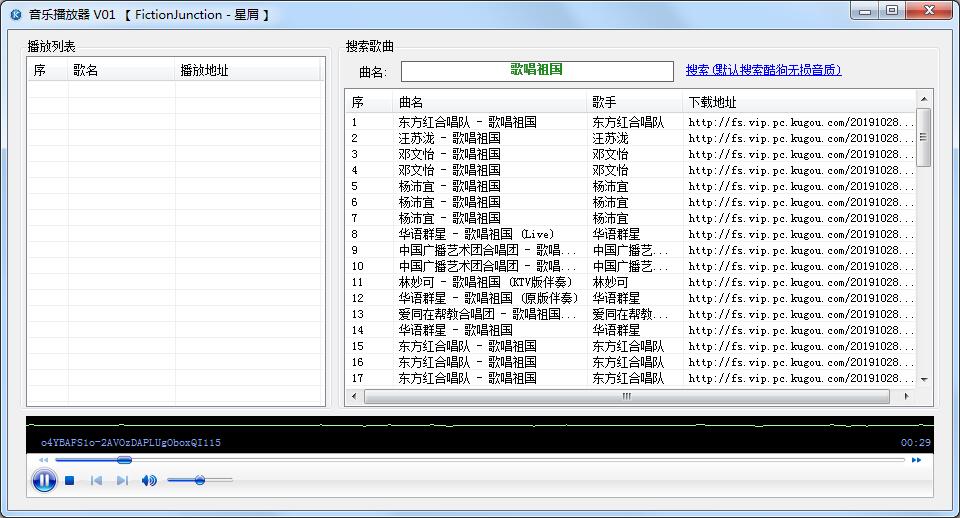界面分为两个列表,左边控制播放,导入,导出播放列表,右边下载,双击试听,添加到播放列表等功能,右键下载之后会默认替换成本地路径,添加之后就可以本地播放了,麻烦的地方就是得一首一首的搜索。
