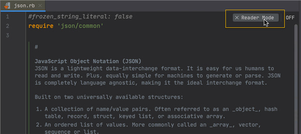 此模式将只读文件和外部库中的文件呈现为更易于阅读的格式。 您可以通过点击编辑器右上角的书本图标来开启和关闭此功能。 要自定义阅读器模式设置,请转到 Preferences / Settings | Editor | Reader Mode。