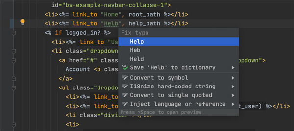 RubyMine 2021使您可以更轻松地避免文本拼写错误。 建议的修复现在直接在 Alt+Enter 菜单中显示,就像代码的快速修复一样。