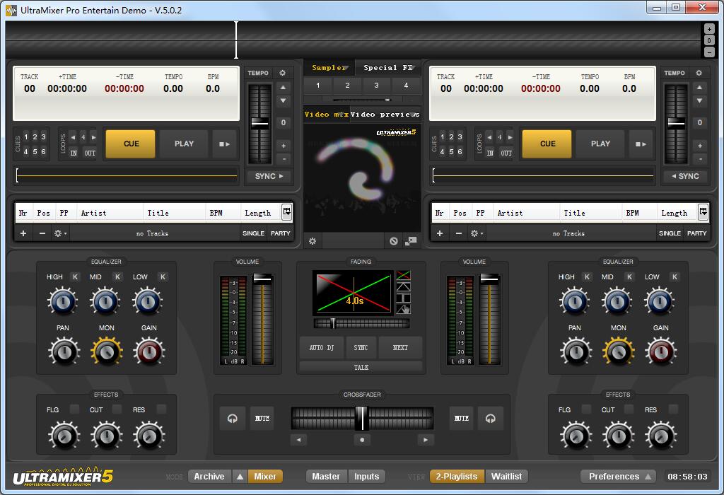 UltraMixer Pro Entertain是一款专业的DJ混音工具,除了常见的DJ混音软件都有的功能外,UltraMixer Pro Entertain还提供了一些娱乐功能。软件带有14种效果的高清质量的现场视频,总是有一个合适的屏幕。通过将你的图像发射到平面屏幕或投影机上,你的观众将会感到惊讶。