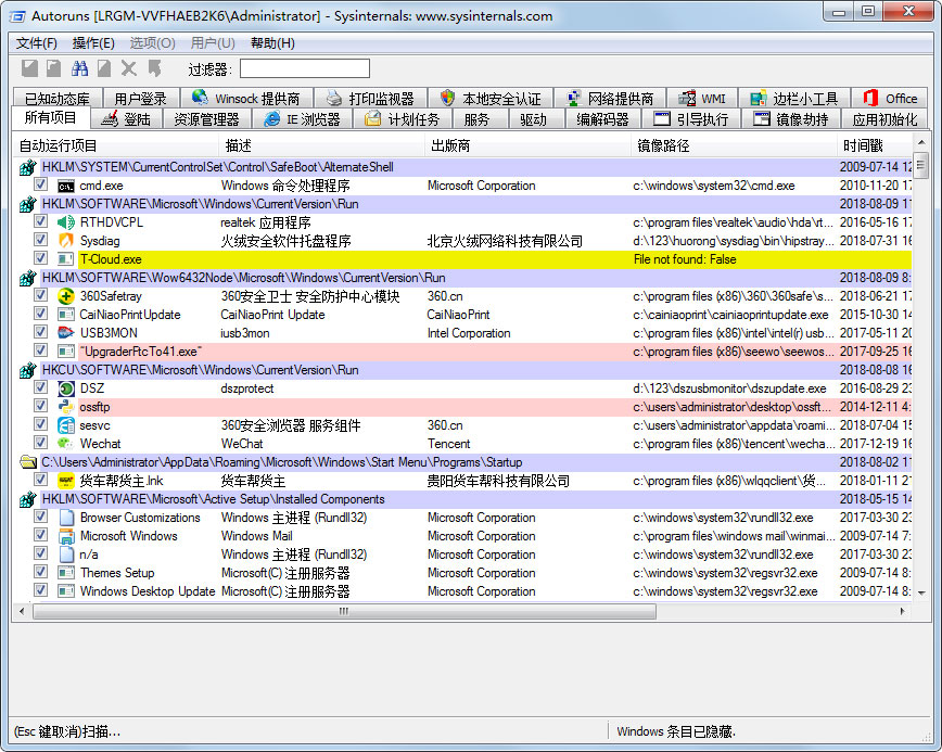 Autoruns是一款出色的启动项目管理工具,autoruns 的功能十分强大,autoruns 不仅可以对各启动项目进行管理,还能直接控制注册表,此外软件可以直接利用google和MSN进行网上搜索。它也可以直接管理不同的登陆帐户,随时把操作的记录保存为文件。