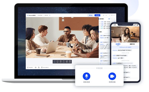 支持直播频道管理、多类型直播(文档、桌面共享、音视频)、音视频连麦互动、互动聊天。