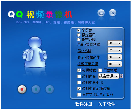 QQ视频录像机可以免费录制QQ聊天视频、MSN聊天视频、UC聊天视频、ICQ聊天视频、泡泡聊天视频、雅虎通聊天视频、网络视频聊天室、网络电视、电影片断、MTV录像、卡拉OK录像、个人视频、可视邮件、教程和课件及帮助手册使用的动画演示。