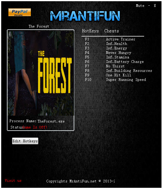 森林十项修改器由“MrAntiFun”制作,有无限体力,无限电池,不会口渴和饥饿,一击必杀,上帝模式等十项修改器功能,需要的玩家不要错过哦!