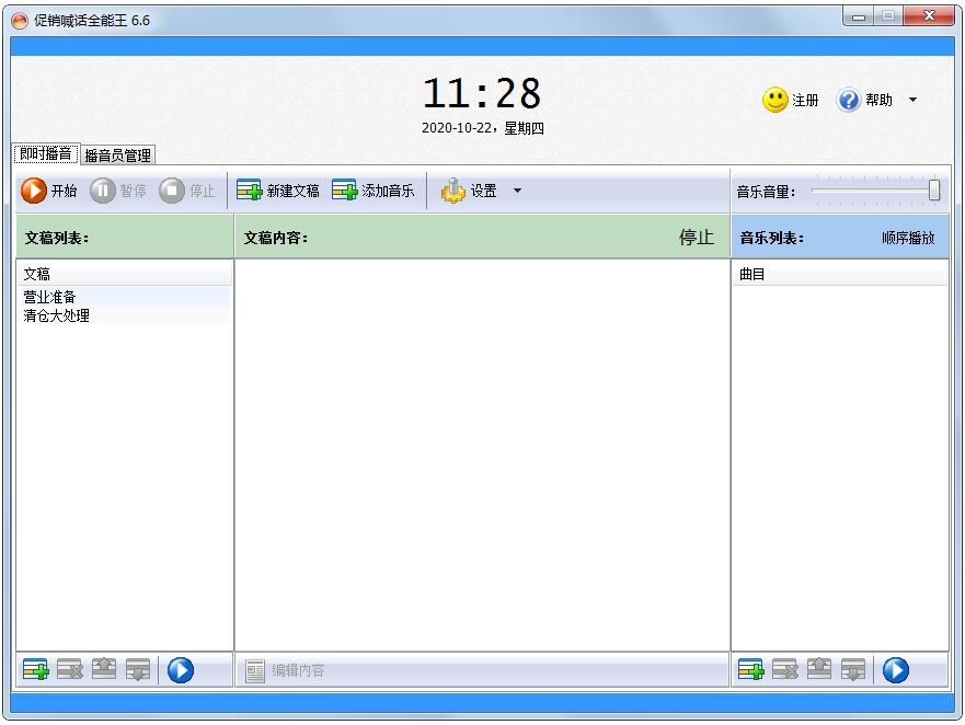 8.在播音过程中可以创建新的播音稿,可任意切换播音内容和背景音乐,整个播音过程完全由您掌控,随心所欲。