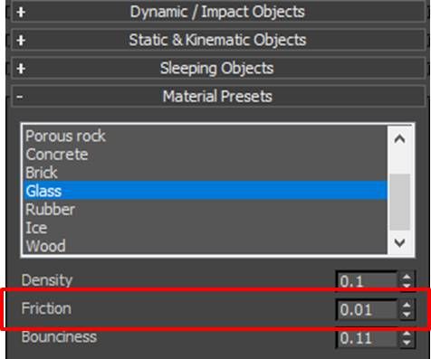 同样地,再选中玻璃材质,调低其摩擦力数值,由于玻璃的摩擦力数值已经足够小,可不作更改。