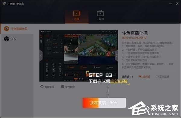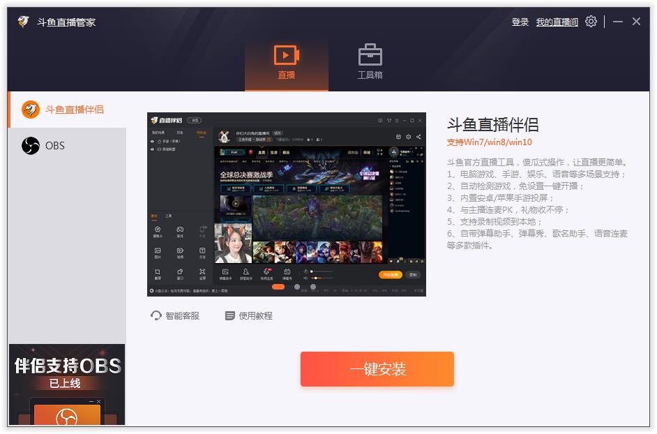 通过这款软件,您不需要到网络上下载伴侣,不需要到斗鱼官方下载直播软件,直接在管家上就能将直播伴侣安装。