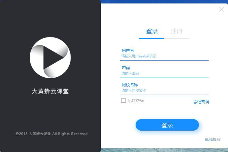 大黄蜂云课堂播放器是一款由大黄蜂云课堂官网开发的PC客户端软件,输入用户名密码网校名称即可登陆,你可以通过大黄蜂云课堂播放器观看优质的教学视频,这款软件的特点是防翻录防破解,不用担心课程被其他录屏软件进行翻录,需要的小伙伴可以下载本软件使用。