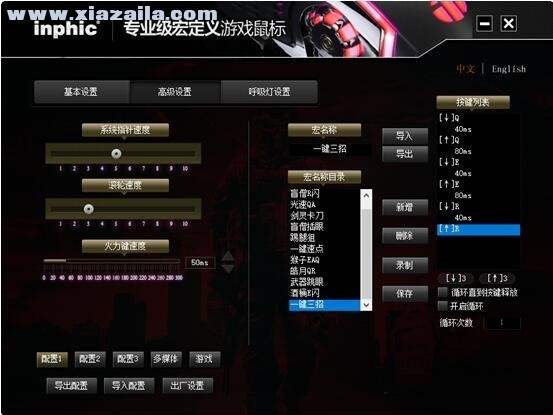 接着我们来看高级设置。高级设置中,左侧是对系统指针速度、滚轮速度等进行调节。右侧则是驱动中的又一个重要功能-宏定义。驱动中已经预设12个宏,玩家需要就可以直接调用,还可以进行导入导出、删除等操作。如果想要录制自己的宏,在宏名称里填上新的宏名称,点击“新增”就可以添加到宏名称目录里,之后点击“录制”,输入自己想要的按键组合,再“停止”及“保存”后就可以了。