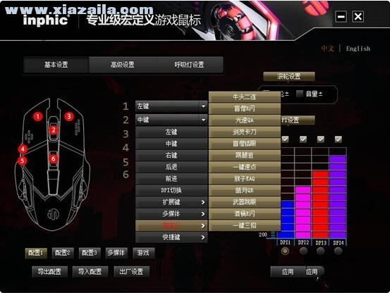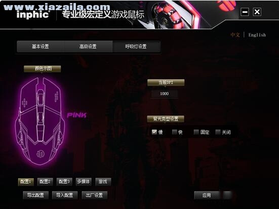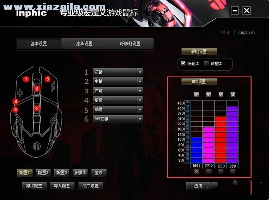 打开驱动程序主界面,可以看到英菲克PW2鼠标的功能设置还是非常丰富的,有基本设置、高级设置、呼吸灯设置三个大选项,每个大选项中又对按键功能、DPI、宏编程、灯光等方面进行详细设置。界面左下方配备了配置1、配置2、配置3、多媒体及游戏共5个配置文件选项,每个配置文件中都可以对DPI、按键功能等进行单独设定,通过切换不同的配置文件,即可快速对应各种应用需求,如办公、上网,或是英雄联盟、CF等不同的游戏,全面应对不同需求。