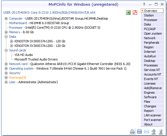 7.检测站组件:处理器,BIOS,内存,主板,光驱,硬盘,视频,语音,网络卡,IP,MAC…;