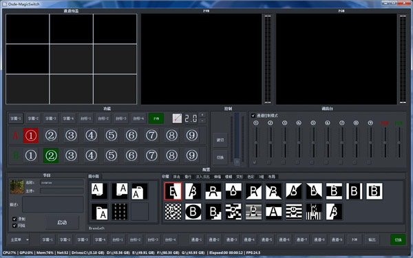 免费切换台软件,OSDE-MagicSwitch数字切换录播系统是一款使用在视频实时切换、直播、录制、制作一体的全能型软件,一套软件即可轻松替代传统广电的导播切换、字幕、调音台等繁琐且昂贵的硬件设备。具有各种图像混合、特技转换效果、字幕叠加、色键处理等特技切换功能,也可以对网络视频、现场影像、文件素材、VGA等的进行(单路、多路)直播、录制,编码、转码(ip转码)、输出等功能。