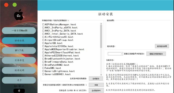 软件集成常用MacOS驱动程序,支持在win10下安装MacOS驱动程序,也支持用户自行导入驱动程序进行安装。