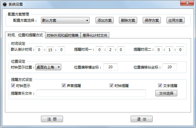 (3)提醒:声音提醒、背景闪烁、文本提醒3种提醒任选。可以根据需要设置两个提醒时间。