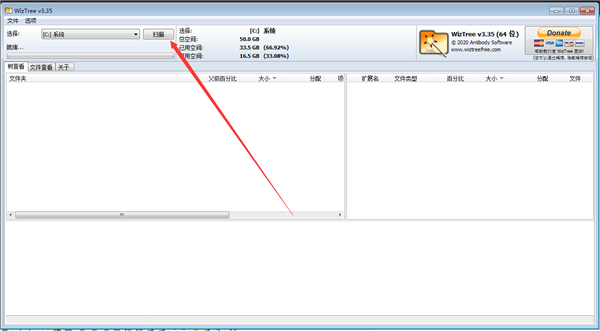 1、WizTree界面中会使用目录树方式把文件夹从大到小排列,并且还会显示占用百分比、占用空间、文件数量、子文件夹数量等信息。