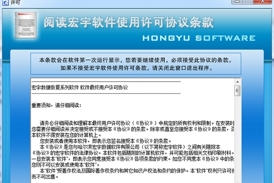 软件首次运行,会出现许可协议,勾选接受许可协议后,才能使用宏宇ZIP文件恢复向导进行数据的恢复。