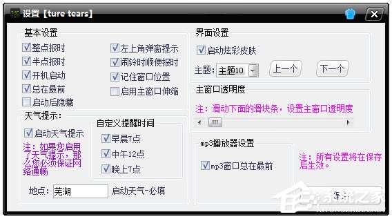 3、设置包括了基本设置、界面设置、天气提示、自定义提醒时间、mp3播放器设置等;