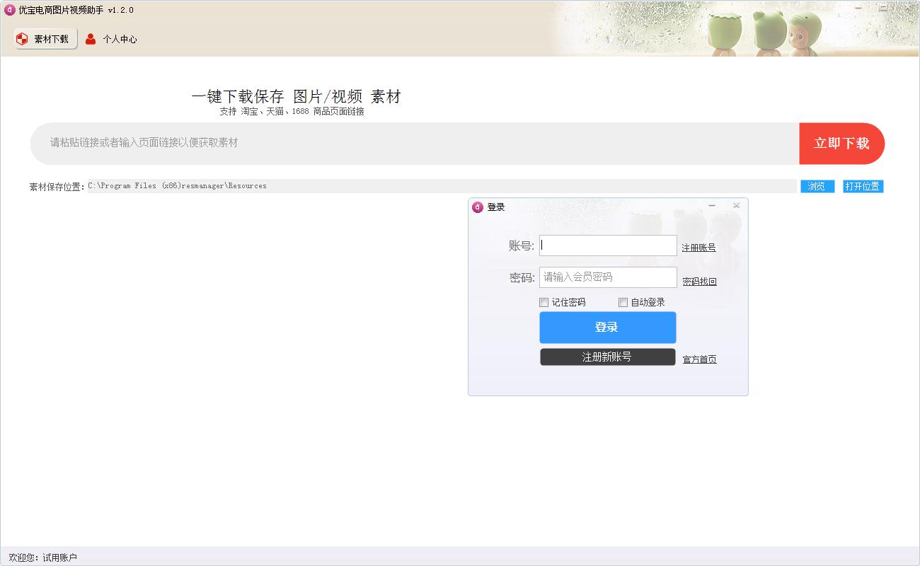 优宝电商图片视频软件是一款专为网店店主打造的视频图片内容采集工具,该软件支持淘宝、天猫、1688等商品页面信息采集,能够一键下载图片视频,使用方便,可自定义保存路径,为网店店主们带来的简单便捷的办公新体验。
