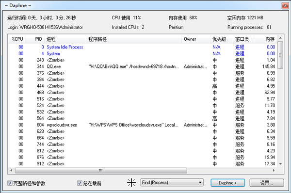 Daphne 是一款扩展的任务管理器,特别提供了用于中止(终结),控制和调试进程的功能。该软件允许你通过在窗口上简单地拖拽鼠标或者通过在主进程列表当中右键点击的方式来中止一个进程。此外,你还可以通过使用一个热键,或者通过创建一个定制的中止列表来中止多个进程。其它特别推出的功能包括一个窗口属性检查器,保持窗口位于最顶端的选项,设置透明度,开始/停止服务以及更多方面的功能。