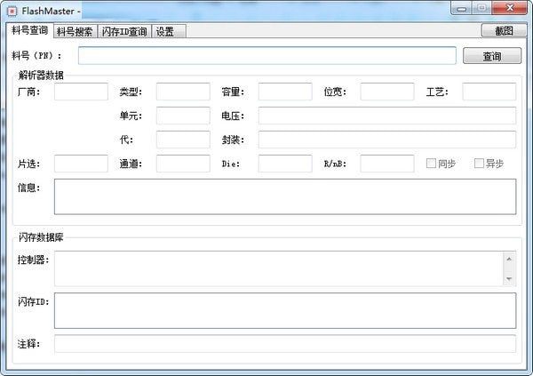 FlashMaster是一款非常不错的U盘闪存料号查询工具,软件为大家提供根据料号查询、根据料号搜索和根据闪存ID查询三种查询方式进行查询相关信息,让你在这可以快速的查询到自己U盘闪存料号信息,操作简单,有需要的用户快来下载吧!