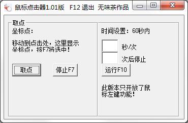 简单鼠标点击器是一款专门为鼠标而制作的鼠标点击软件,可以连续点击一个屏幕上的任意位置,取点坐标点位置,移动鼠标到点击位置,这里显示坐标点,按F7将选中。本版本只开放了鼠标左键功能,F10键运行,F12键退出,可设置60秒内点击时间,或点击多少次后自动停止。
