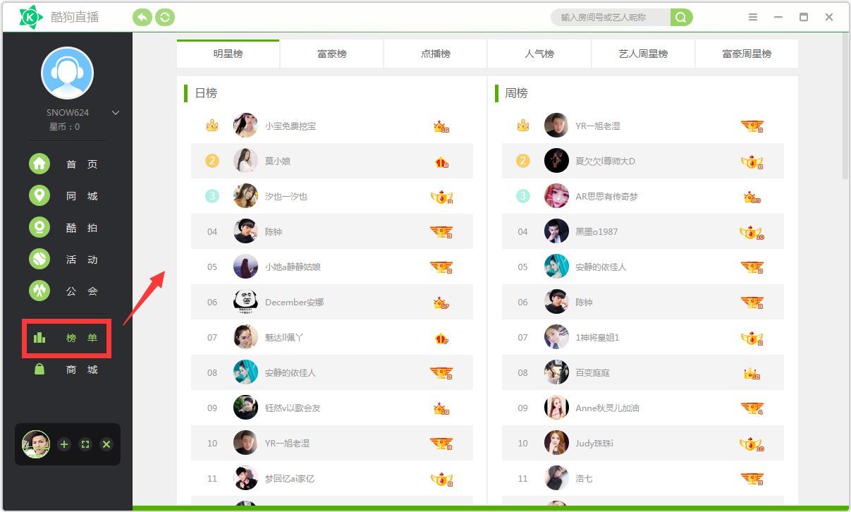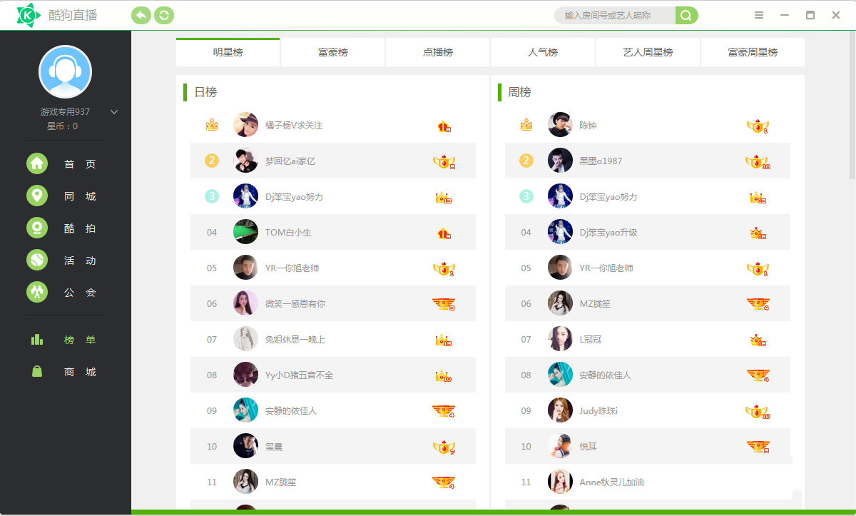提供合理且细分的排行榜,包括有明星榜、富豪榜、点播榜、人气榜和各个礼物的礼物之星榜,在日期上还分为日榜、周榜和月榜。