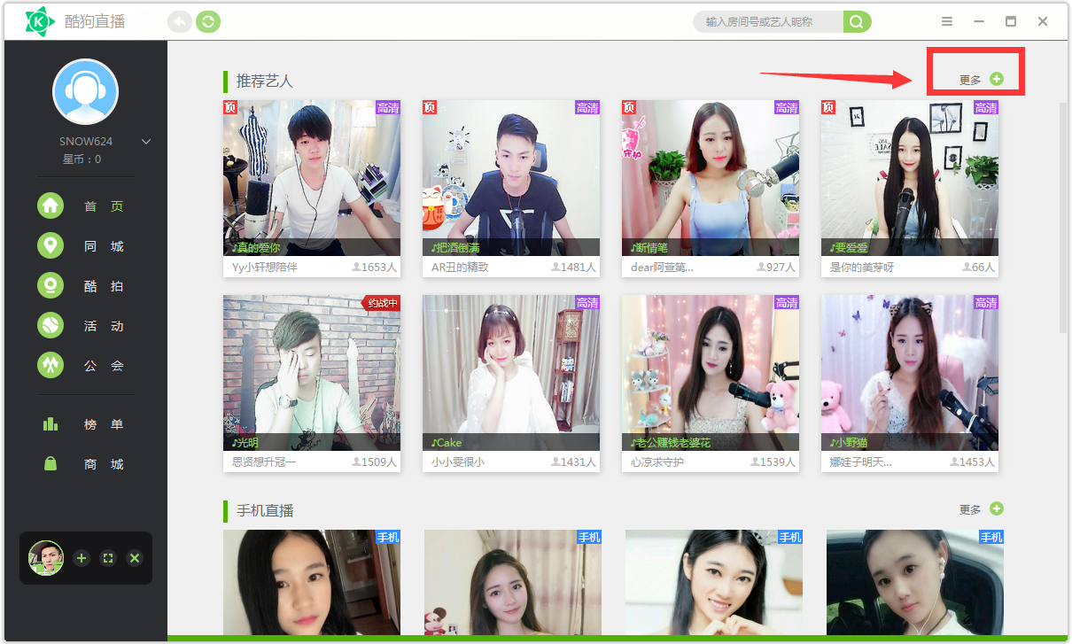 2、点击主播,即可进入主播房间与主播互动,主播右上方的“更多”按钮让你有更多的主播选择;