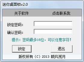 是一款用于锁定桌面的工具,也是游戏挂机桌面锁。是目前市面上效果最好的产品。绿色无需安装,方便快捷。winxp/win2000/win7下测试完美通关,暂时没有发现Bug。