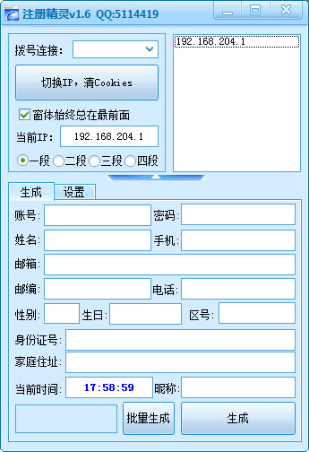 注册精灵软件为资料生成器-姓名生成、手机生成、邮箱生成、昵称生成、身份证号生成、地址生成、区号生成、邮箱生成、账号生成、密码生成、性别生成、姓名生成、换IP,强制粘贴功能,快捷键复制粘贴功能!换多段IP功能 一段,二段,三段,四段!注册手的好伴侣,注册精灵!