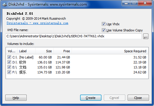 用法:disk2vhd 《[drive:[drive:] 。。.] | [*]》 《vhdfile》